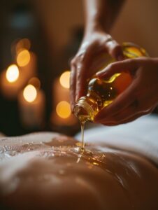 - A person massages another’s back with oil, great for relaxation and stress relief