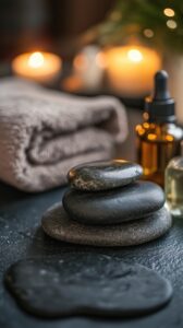 - A serene spa arrangement featuring smooth black stones, calming candles, and essential oils, perfect for relaxation and wellness treatments.